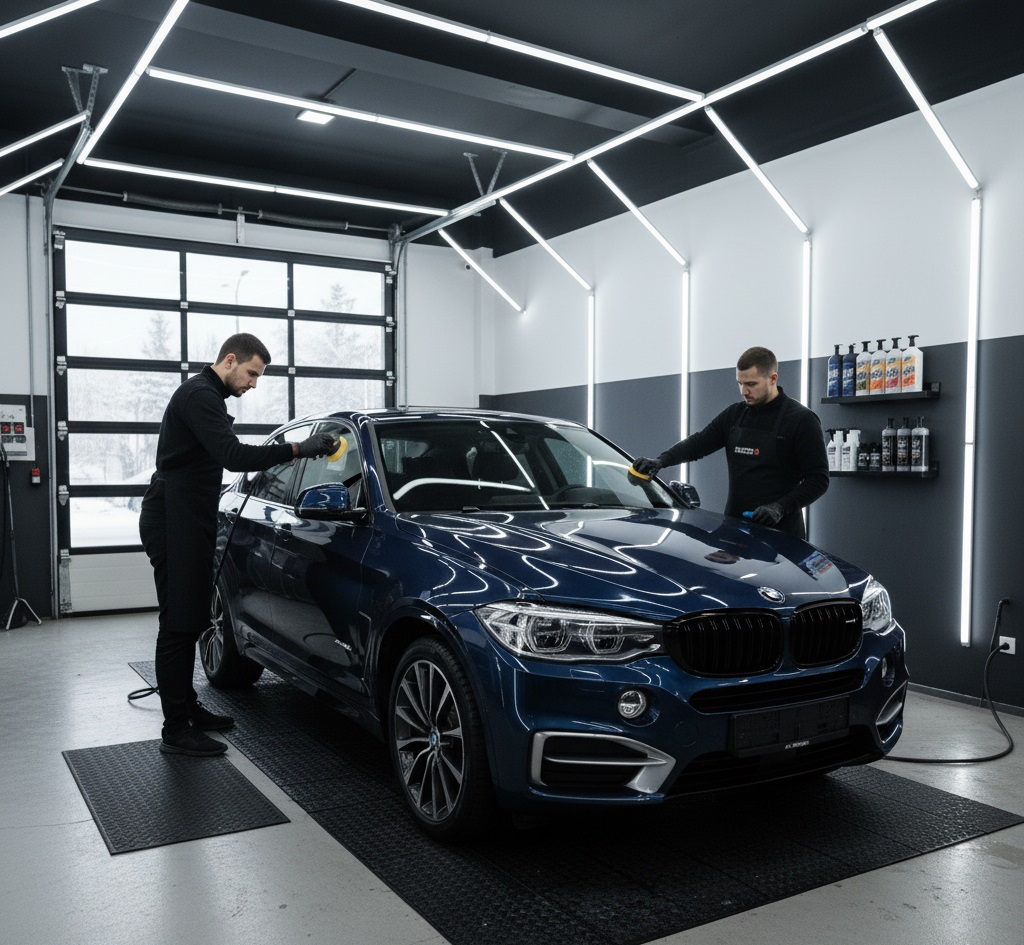 - Нанесение защитных покрытий: Это ключевой этап зимнего детейлинга. Защитные составы создают на поверхности ЛКП прочный гидрофобный барьер, который отталкивает грязь, воду и реагенты.
